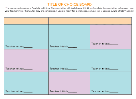 You can implement choice boards when learning a new topic, reviewing a topic, brain breaks, early finishers, project boards, etc.