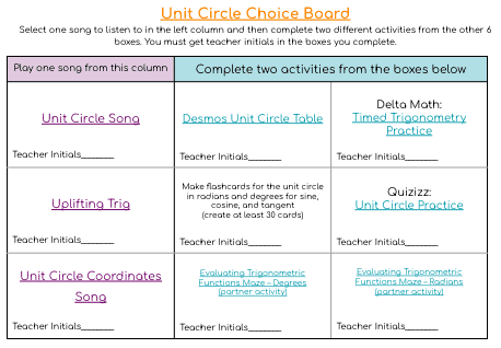 My first (and my favorite) choice board was a Unit Circle Trig choice board. Click the link for a copy of the template! My students also liked the Logarithm Choice Board. I tend to use choice boards when practicing fluency.