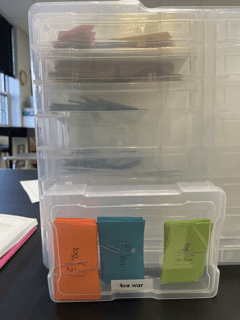 Use colorful cardstock and laminate the cards for long-term use. I can’t tell you how handy it is to have different color decks. Students will accidentally drop a card on the floor and I know immediately which deck it belongs to.