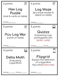Log war is one of my favorite activities to have students practice fluency in evaluating logarithms. It is played like the card game war. If you are unfamiliar with war and want to know more, you can read my full blog post about Log War. I made 4 sets for my students to use. This game is best played in pairs or a group of 3. I made 4 sets to use with my class of 26 and nobody seemed to be waiting on a set of cards.